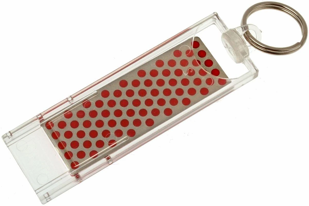 Acopla esta piedra de afilar compacta con superficie recubierta de diamante a tu manojo de llaves y siempre podrás afilar rápidamente tu cuchillo. El tamaño de la piedra de afilar es, por supuesto, limitado, pero se trata de una verdadera piedra de afilar DMT, de primera calidad. Así que puedes utilizar seriamente esta piedra de afilar.