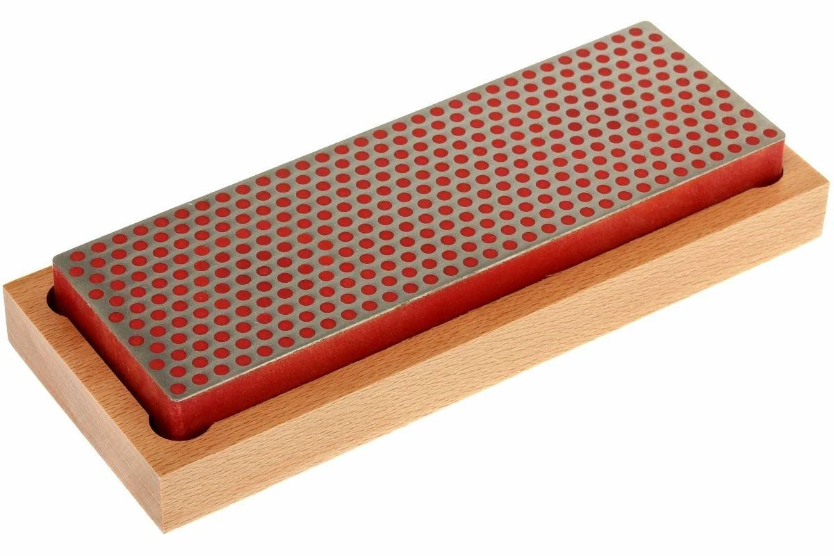 Piedra de afilar con superficie de afilado de diamante con el conocido patrón de círculos. La piedra tiene un grano fino. Esta piedra de afilar se entrega en una caja de madera dura con pies antideslizantes.