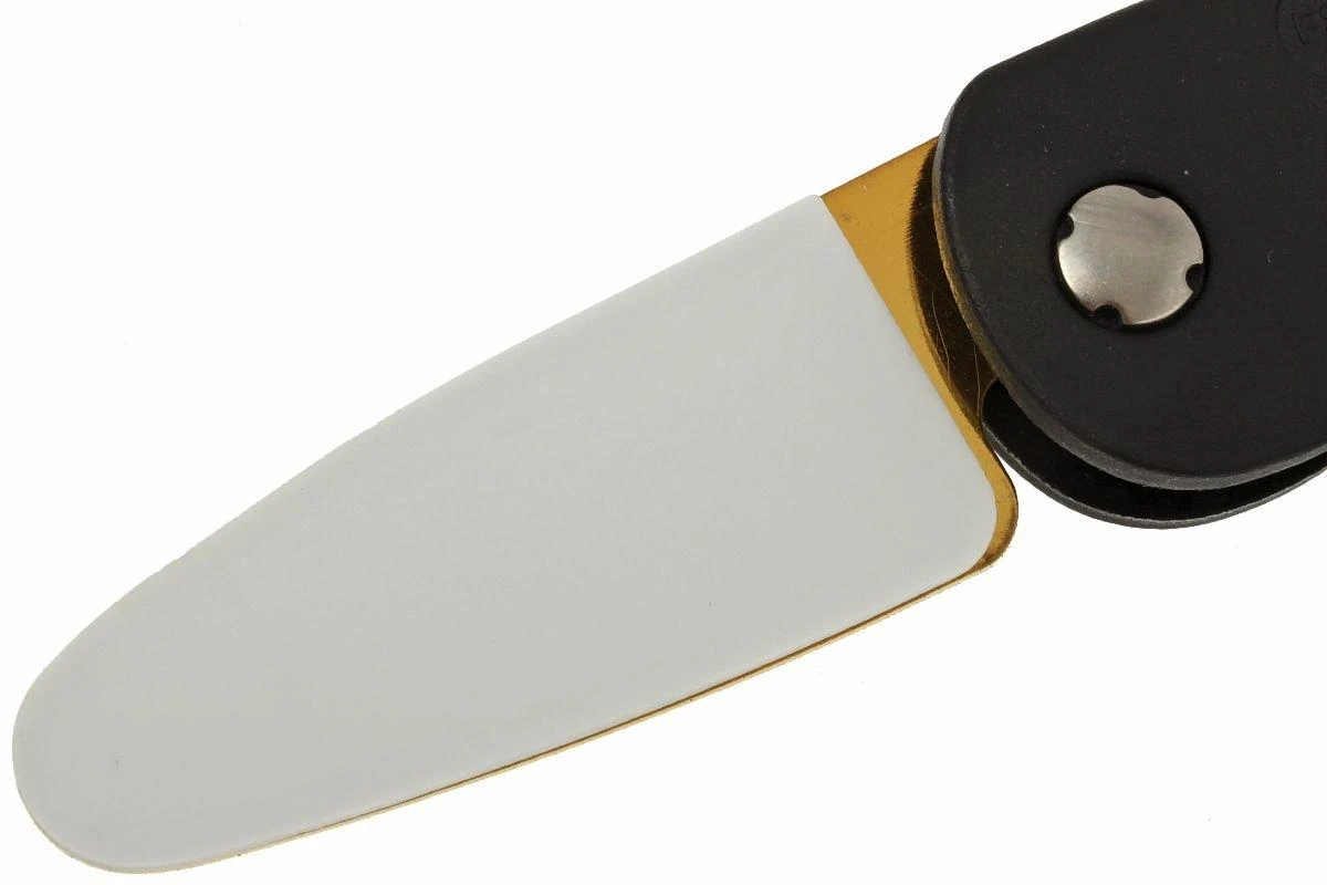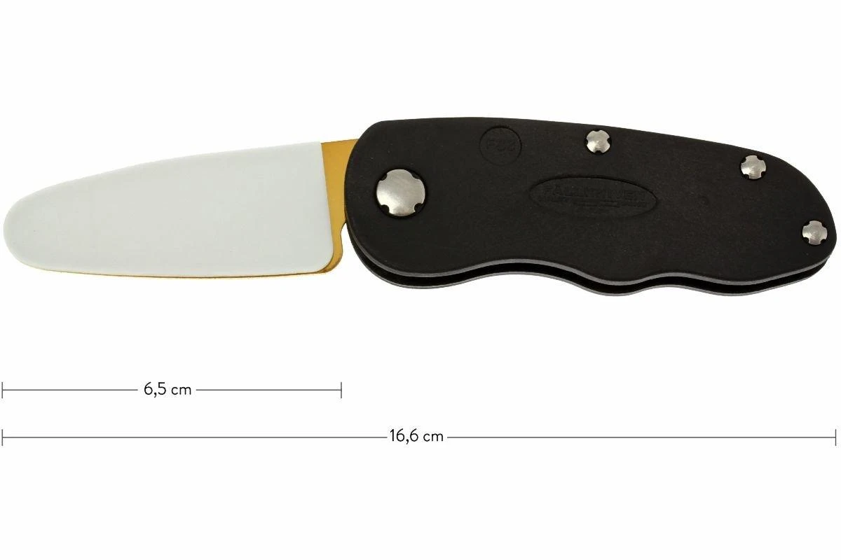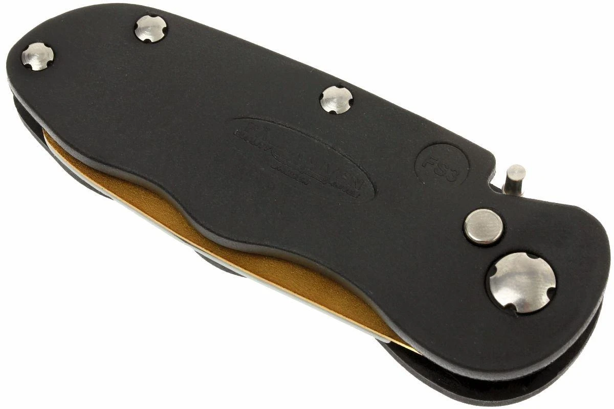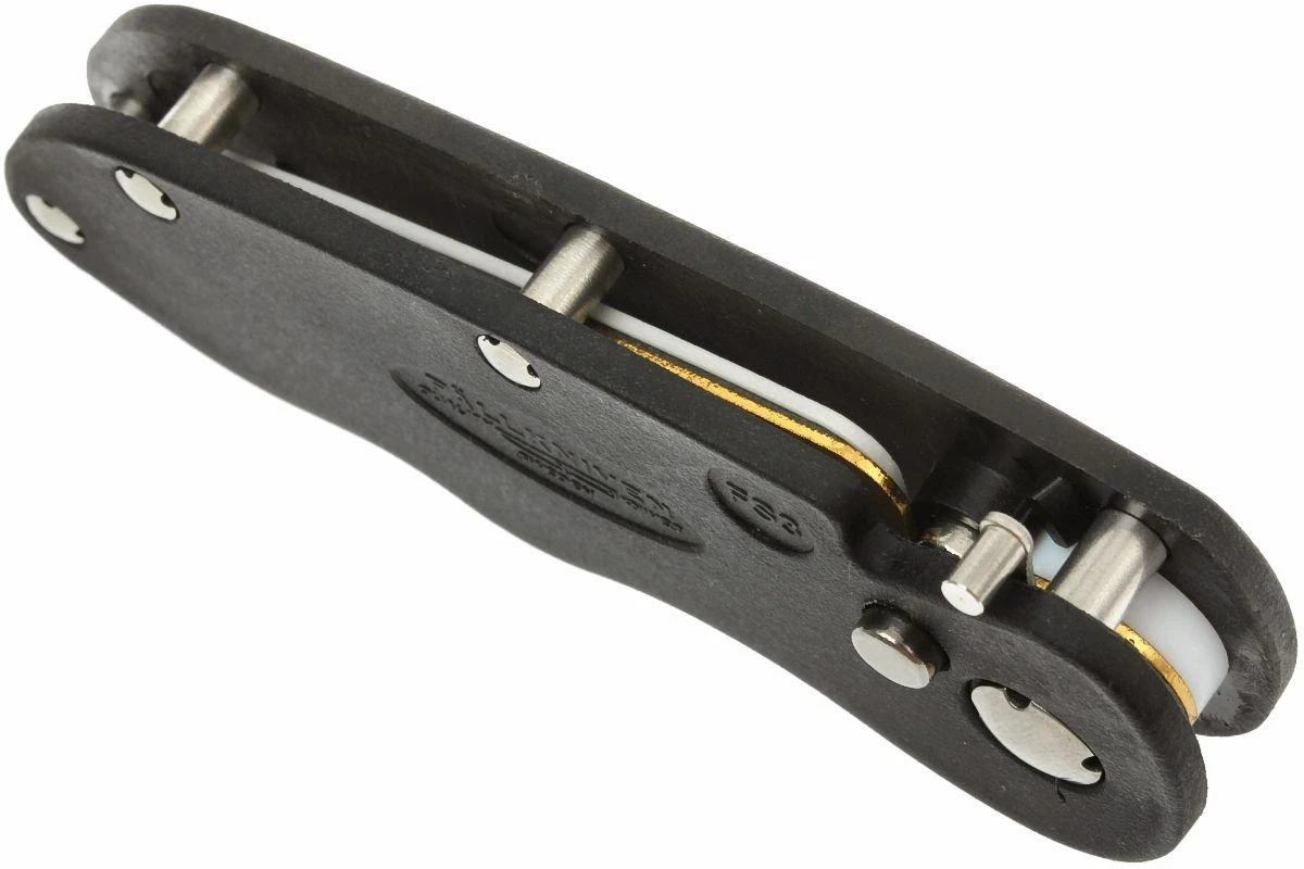 La piedra de afilar Flipstone es una piedra de afilar que se pliega automáticamente y se puede utilizar por dos lados. Las dimensiones podrían compararse con las de una navaja. La FS3 es ligeramente más pequeña que la FS4. Por lo tanto, puedes llevar siempre contigo esta piedra de afilar. El lado amarillo es una piedra de afilar de diamante con un tamaño de grano de 25 micras. La reparación del corte se realiza con este lado, mientras que el afilado máximo se determina con el lado cerámico de la piedra de afilar. Las dos piedras de afilar están pegadas y no se sueltan.