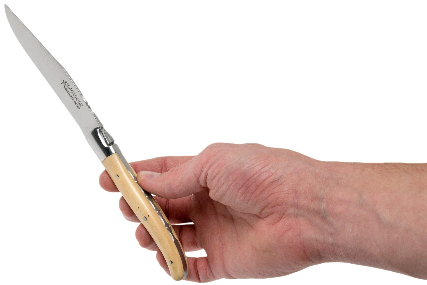 Este juego de cuchillos para carne Fontenille Pataud se compone de dos cuchillos de mesa Laguiole con mango de madera de boj francés. Se trata de un tipo de madera ligera con una estructura muy fina. La madera de boj sólo puede comprarse en pequeñas cantidades y tamaños, lo que la convierte en un tipo de madera relativamente caro. La tradicional «cruz de pastor» en el mango también tiene un aspecto increíble. La cruz, formada por remaches, hace referencia a la leyenda de los pastores católicos que, durante sus cruzadas a España, querían rezar lejos de una iglesia o capilla. Ponen el cuchillo, con la cruz hacia delante, en el suelo para rezar una oración.