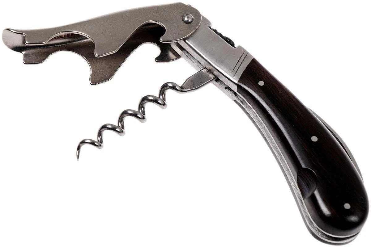 Con el sacacorchos de camarero Laguiole Magnum de Fontenille Pataud abrirás tu botella de vino de la misma manera que lo haría un sumiller. El cuchillo combina tres funciones: es un corta cápsulas, sacacorchos y abrebotellas. Hecho por los fabricantes de cuchillos franceses Fontenille Pataud. Este sacacorchos de camarero tiene un mango hecho de ébano y acero inoxidable que le proporciona un diseño elegante y estilizado.