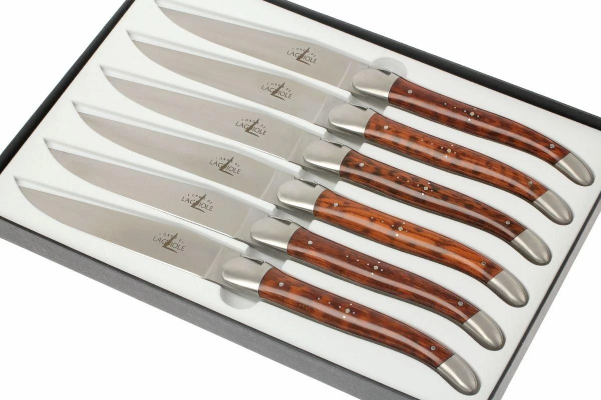 Este juego de cuchillos de mesa Forge de Laguiole se compone de seis hermosos cuchillos hechos a mano. La hoja afilada tiene un núcleo de acero inoxidable francés y conserva su filo durante mucho tiempo. Los mangos de madera de serpiente irradian lujo y están equipados con la característica cruz de pastor en forma de siete remaches. Y, por supuesto, la típica abeja de Laguiole también se encuentra en el lomo de las hojas.