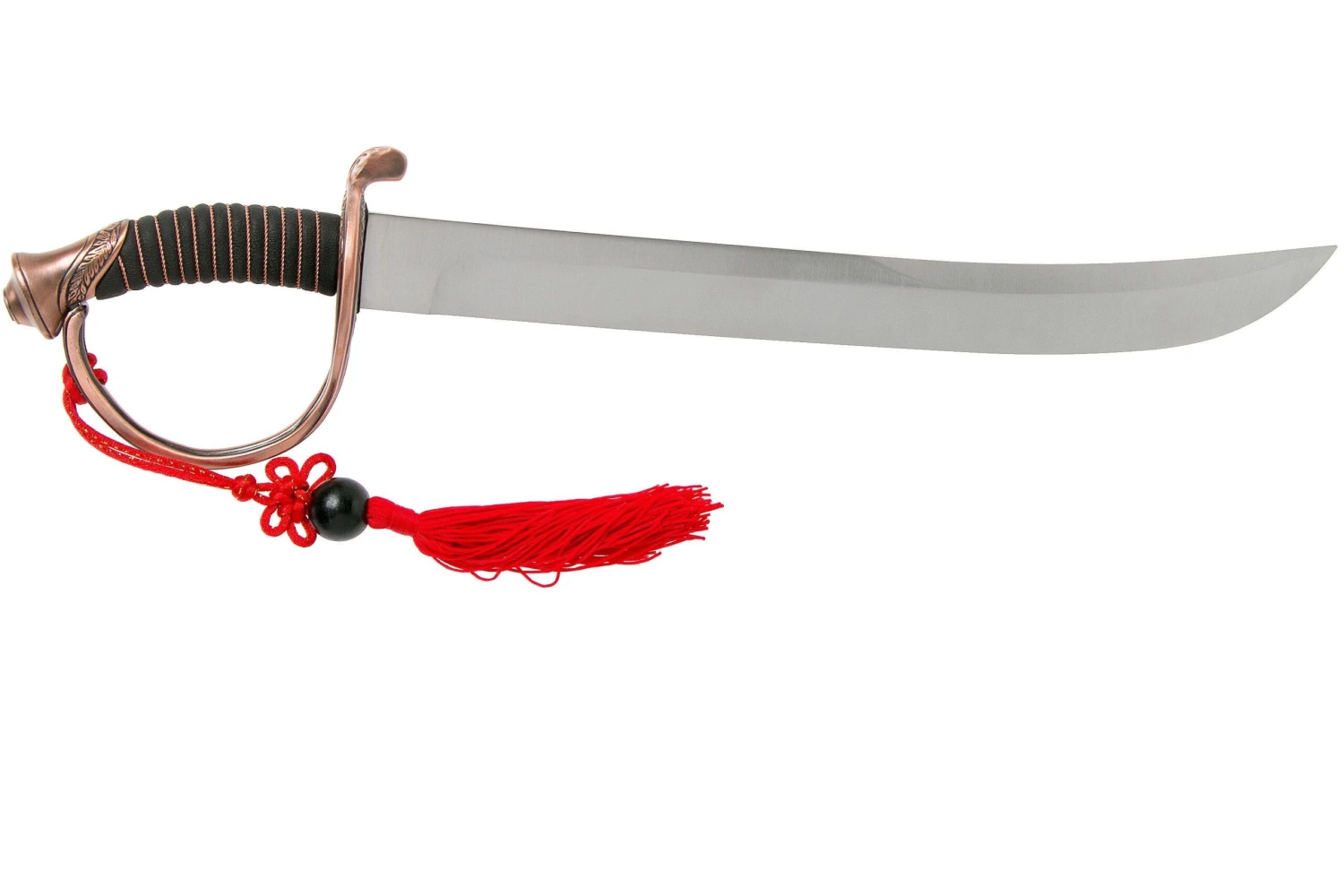 Como de costumbre en la marca Fox, este extraordinario sable de champán de alta calidad también se fabrica a mano en el famoso taller de Maniago, Italia. Este sable irradia lujo. El adorno del mango es un diseño notable y tiene un impresionante acabado en bronce, al igual que el guardamanos. El mango está realzado con cuero negro y rematado con una borla de color rojo vivo. La hoja está hecha de acero al carbono no inoxidable. El sable se presenta en una lujosa caja de madera y un soporte de madera. Con él puedes presentar este sable en la caja de champán. Pero también en tu mesa o en la pared es una verdadera obra de arte. Este sable es el regalo perfecto para cualquier entusiasta del champán.