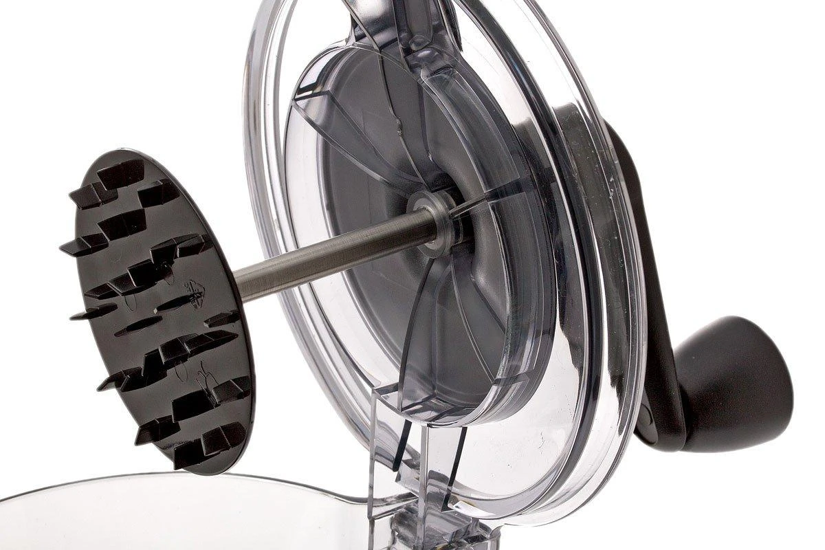 La Gefu Spiralfix es una cortadora en espiral muy práctica. En un abrir y cerrar de ojos puedes preparar los más deliciosos calabacines. Funciona un poco como un sacapuntas. Atornilla el porta alimentos a través de la tapa. En este soporte se coloca la manivela con la que se cortan las verduras. El cuchillo puede ajustarse a cuatro grosores: 3 mm, 6 mm, 12 mm y 55 mm.