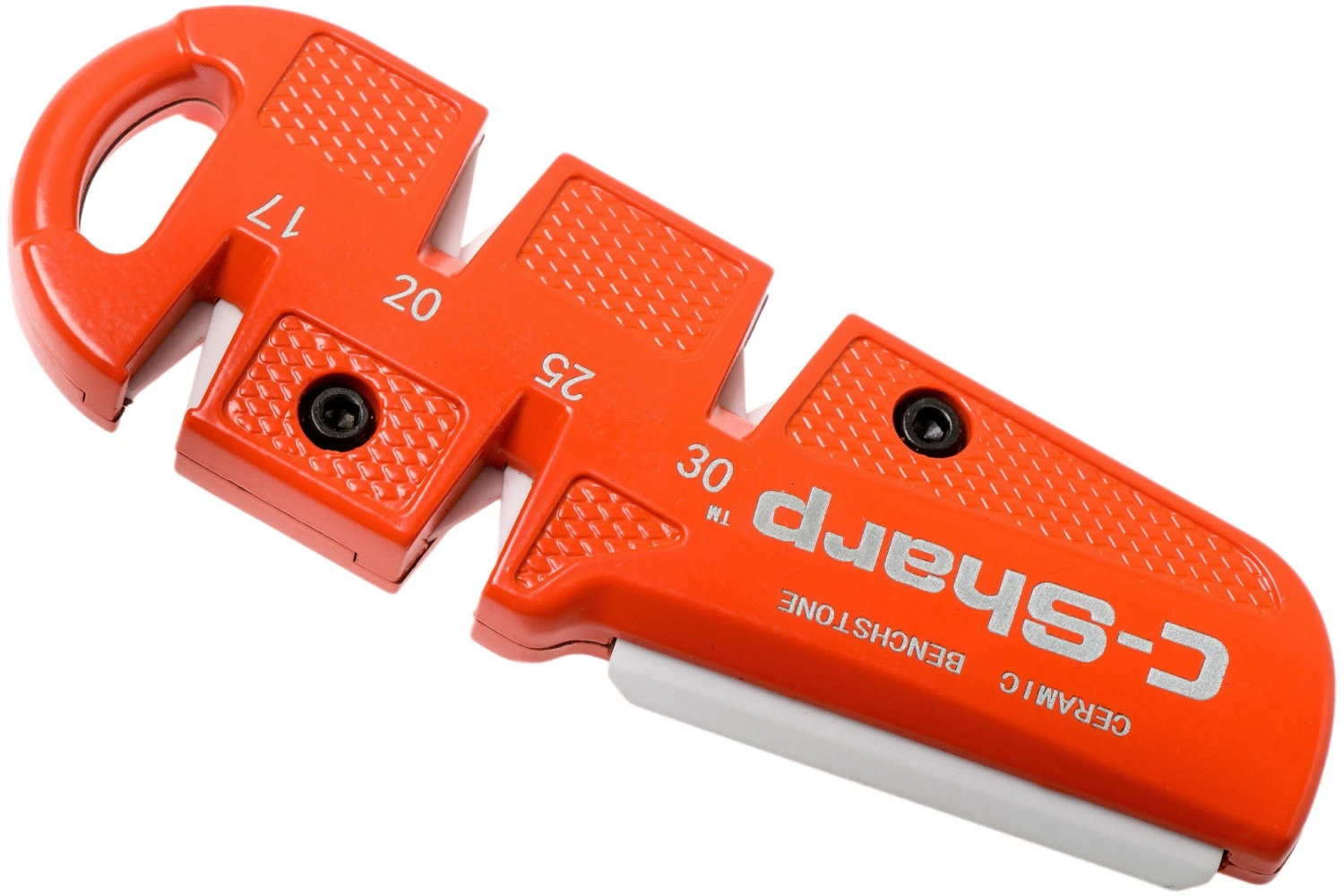 Este afilador de cuchillos de cerámica Lansky C-Sharp es un práctico afilador de cuchillos para los desplazamientos. La C-Sharp puede, al igual que la Quadsharp, afilar cuchillos en cuatro ángulos diferentes: 17, 20, 25 y 30 grados. La ventaja de estos ángulos fijos es que puedes seleccionar fácilmente el ángulo correcto. Incluso las hojas dentadas pueden afilarse con la chaira cerámica integrada. La carcasa de la Lansky C-Sharp está hecha de metal y es decente y sólida. Gracias al color naranja brillante, no será imposible perder este afilador.