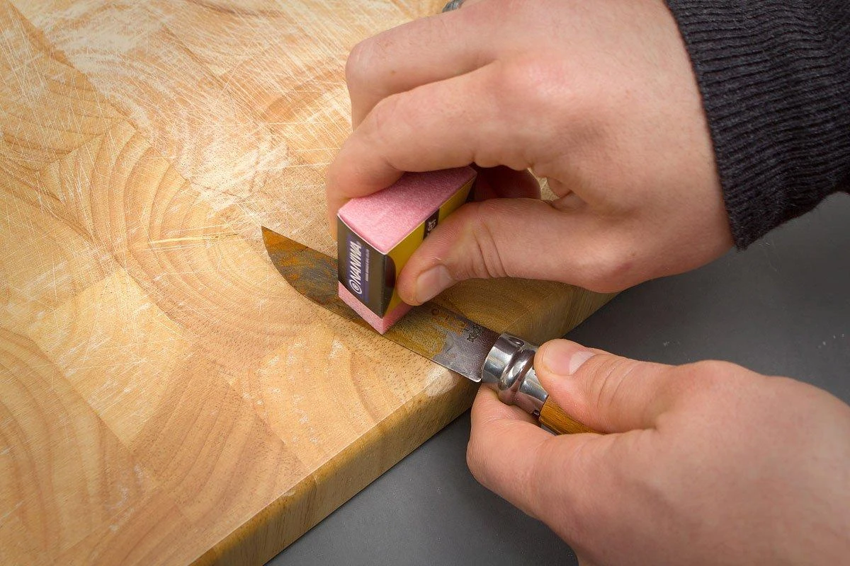 Eliminar el óxido puede ser difícil, pero con el borrador de óxido de Naniwa podrás eliminarlo fácilmente. El óxido profundo es difícil de eliminar, pero esta herramienta te ayudará mucho. El Rust Eraser se siente como una goma de borrar y así es también como se usa. Especialmente las hojas de acero al carbono pueden decolorarse rápidamente. Afortunadamente, esto se puede arreglar con el Rust Eraser.