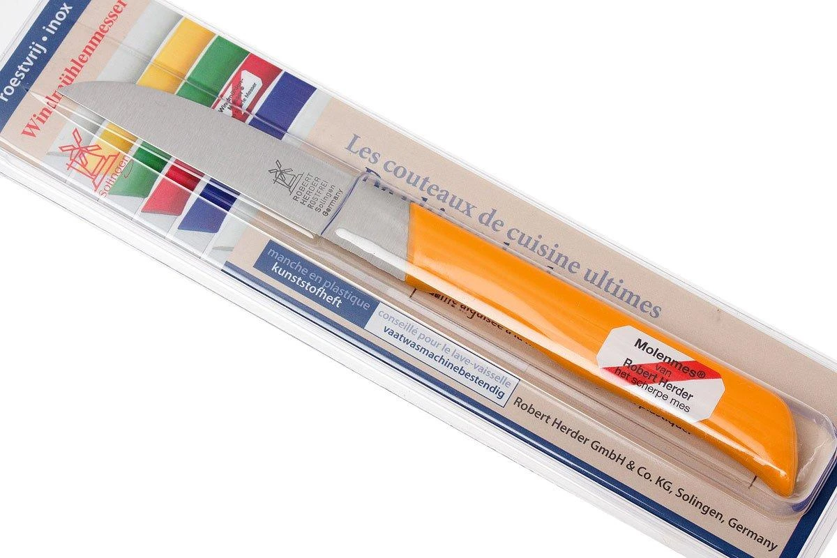 El Cuchillo de pelar Robert Herder Straight Classic 1966 amarillo se encuentra en la línea de los famosos cuchillos de molino de Robert Herder. El cuchillo de pelar es ideal para pelar frutas y verduras. También es apropiado para cortar pescado y carne. El mango de plástico de polipropileno ofrece un excelente agarre. La hoja de acero inoxidable puro está afilada a mano según el tradicional método «Solinger Dünnschliff». El resultado es un cuchillo muy afilado.
