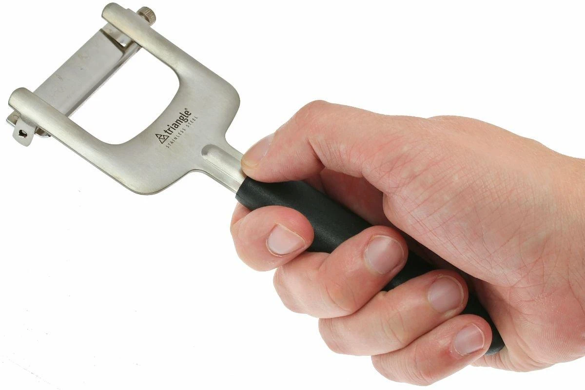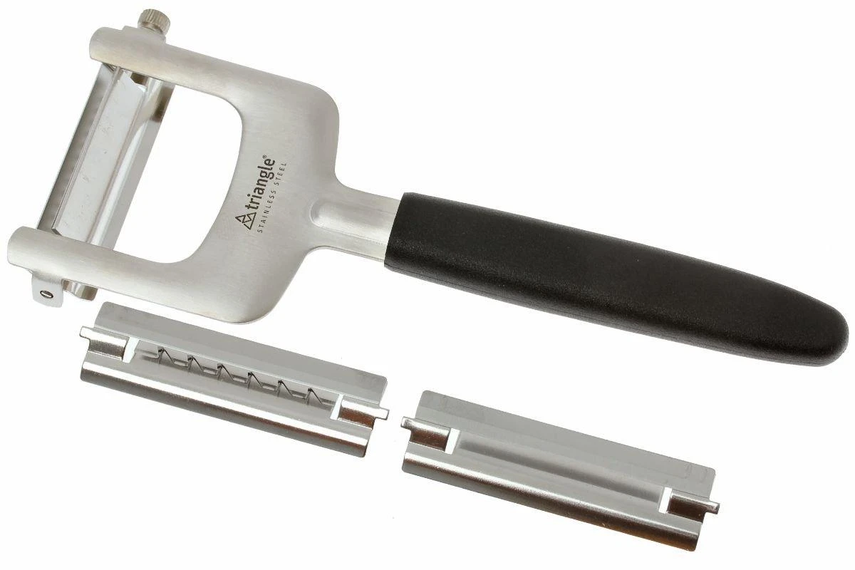 El pelador Triangle Julienne es adecuado para cortar en juliana tiras finas de verduras y frutas como zanahorias, manzanas y calabacines. Las tiras cortadas por igual tienen un aspecto muy bonito para decorar. Esta versión del pelador en juliana se entrega con tres cuchillas intercambiables que pueden utilizarse para cortar tres tipos de tiras diferentes. El pelador está hecho de acero inoxidable y plástico, y puede meterse en el lavavajillas después de su uso.