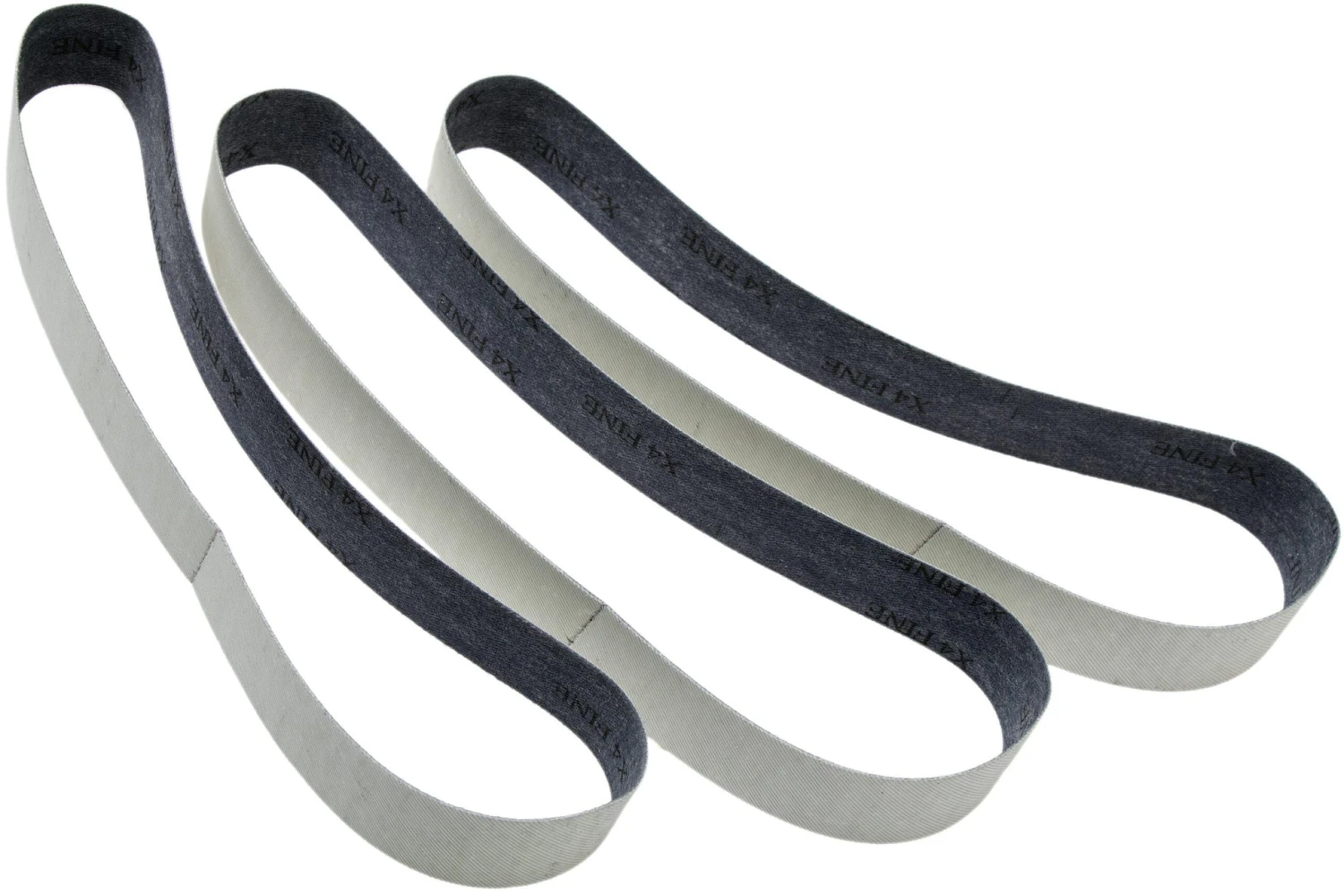 El Juego de cintas de afilado Work Sharp Blade Grinding Attachment, X4 fino, SA0003565 es un juego de tres cintas de afilado fino para el Work Sharp Ken Onion Blade Grinding Attachment. Estas sólidas cintas de afilado, con un tamaño de grano fino, son perfectas para afilar cuchillos, o para mantener tus cuchillos afilados. ¿Quieres afilar tus cuchillos sin filo? Si es así, deberías consultar las cintas de afilado más gruesas de Work Sharp. Esta cinta de afilado es similar a una piedra de afilar japonesa de grano J3000.